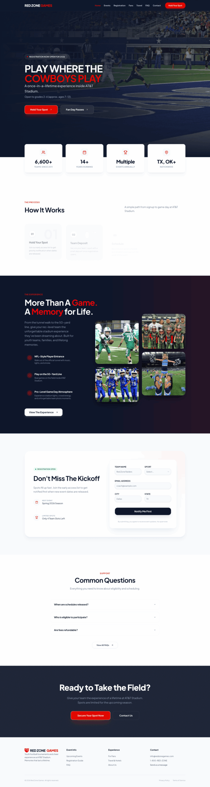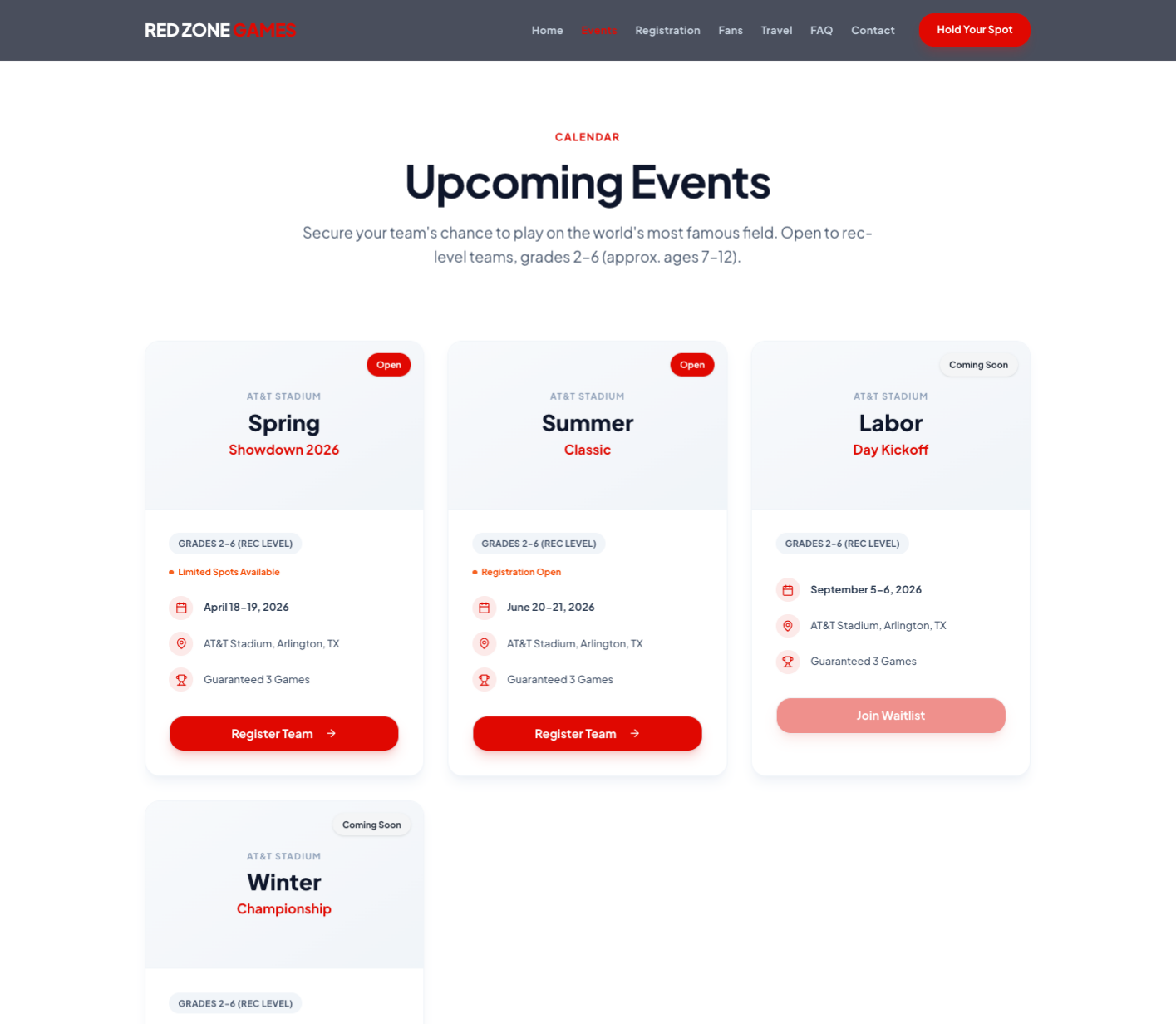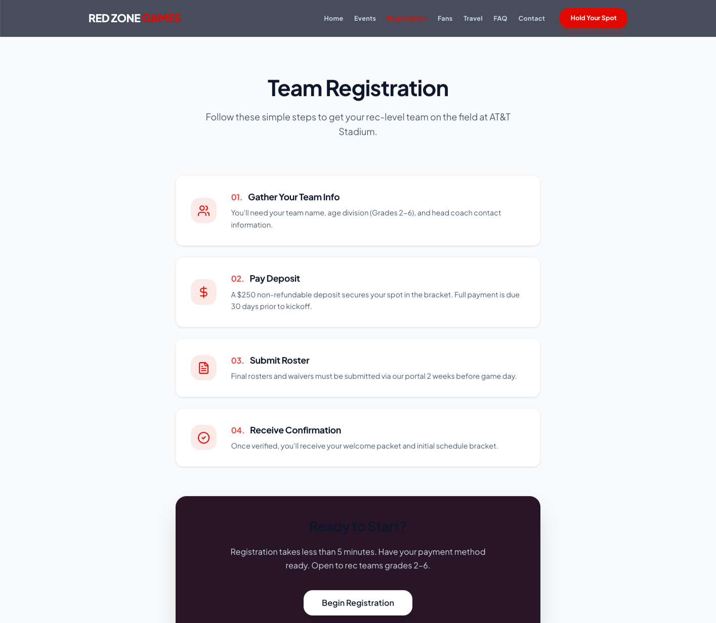 By simplifying navigation and clarifying the registration journey, the redesign helps teams more easily understand how to participate in Red Zone Games events while creating a scalable structure for future growth.