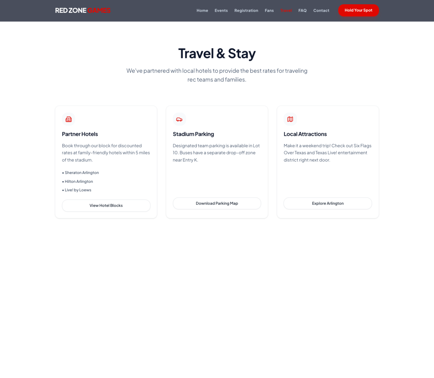 - Elevated primary calls-to-action such as “Register Team” and “Hold Your Spot.”